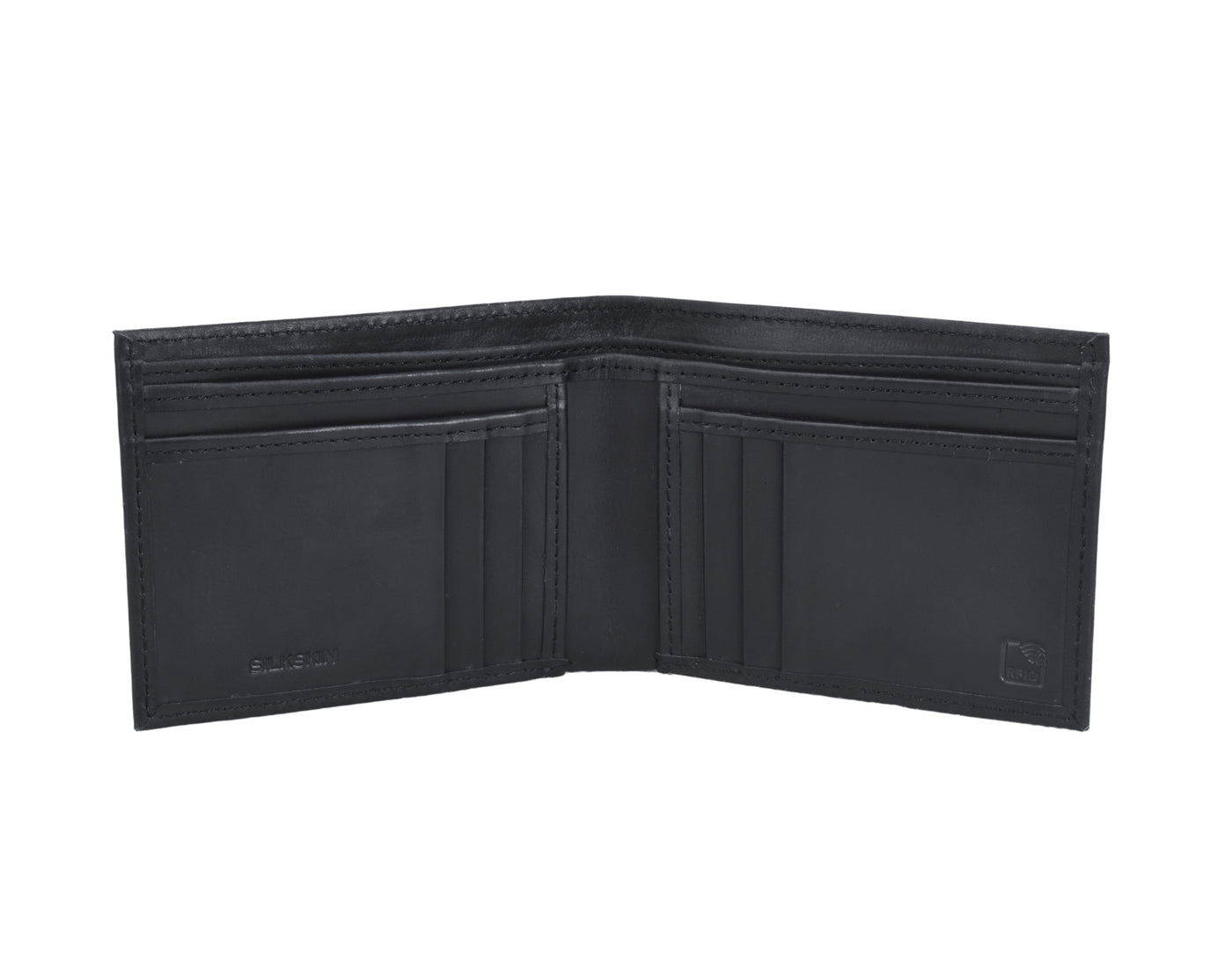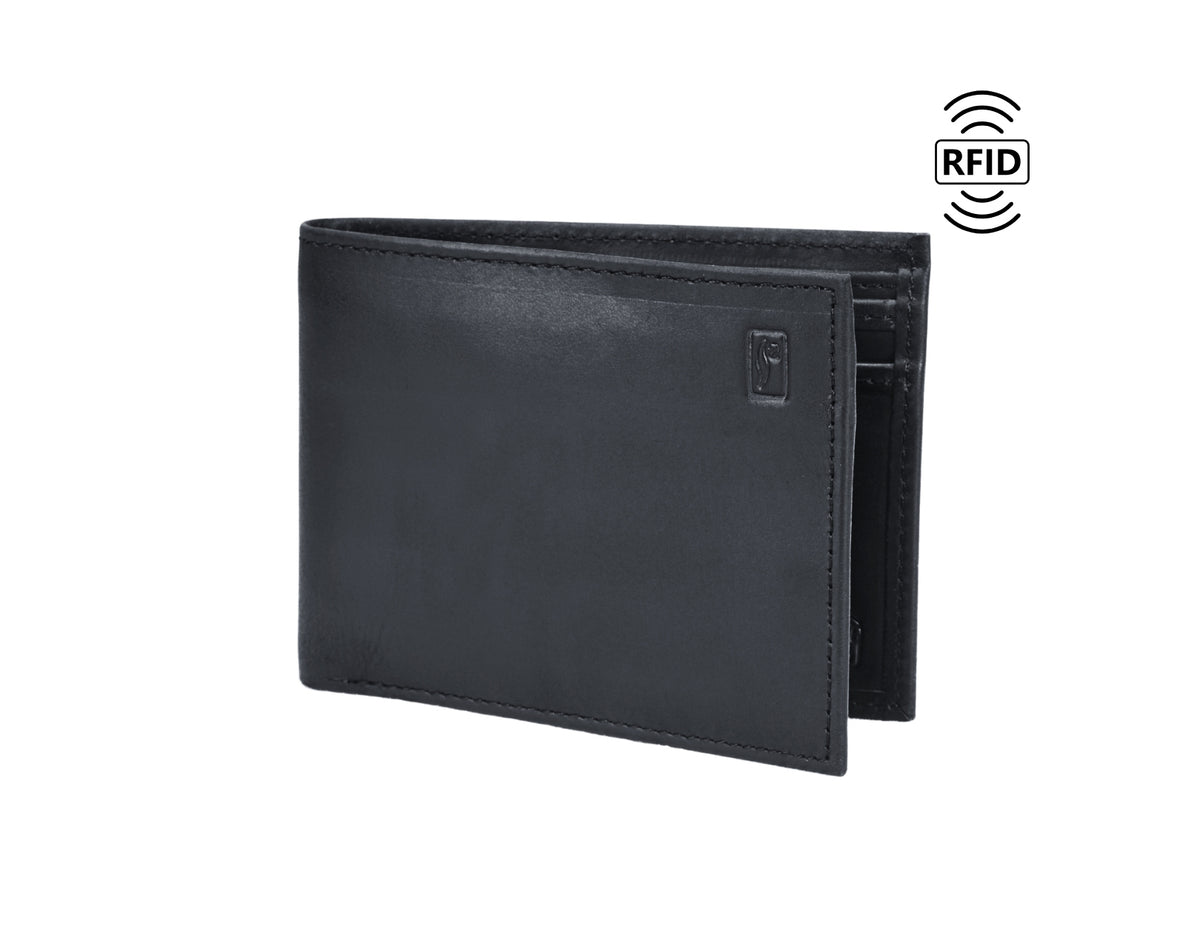 Protect your assets with this essential black leather wallet. Combining classic style with modern security, this bifold features integrated RFID blocking technology to shield your sensitive credit card information from digital theft. Crafted from genuine leather, It includes dedicated slots for cards and two currency sleeves. This is the only wallet a gentleman needs for secure, everyday carry.