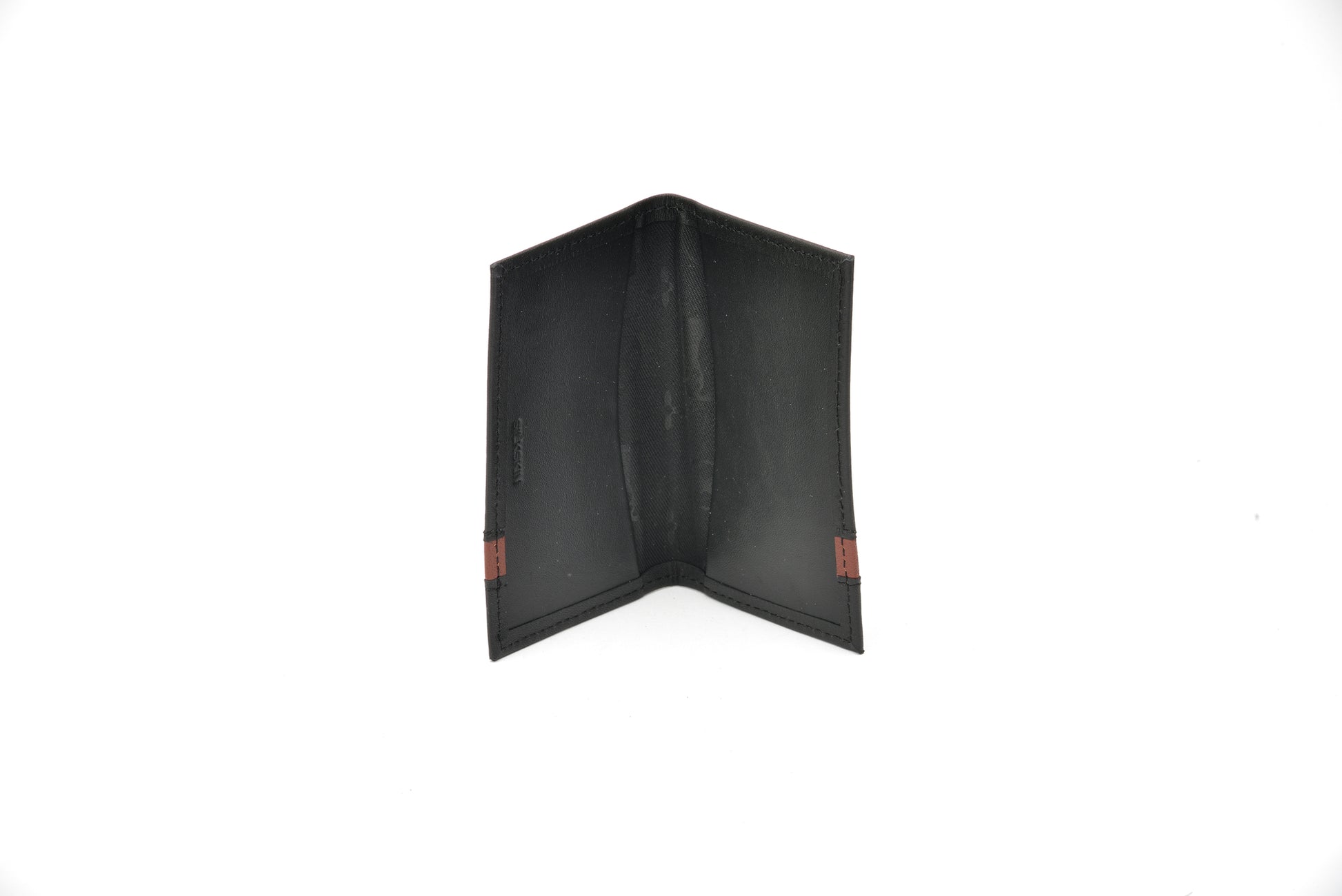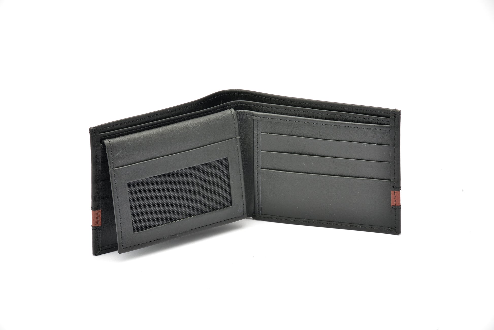Wallet: Six (6) credit card slots, Two (2) cash compartments, Two (2) pockets for receipts/cards, one (1) ID Window.